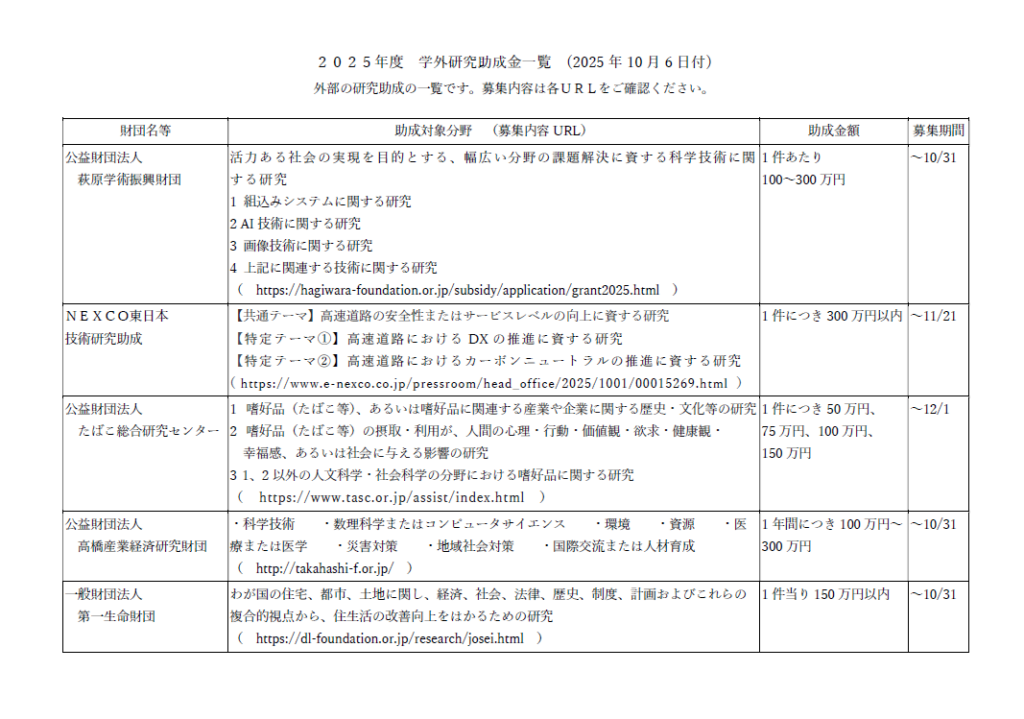 2025年度学外研究助成金(10月6日現在)